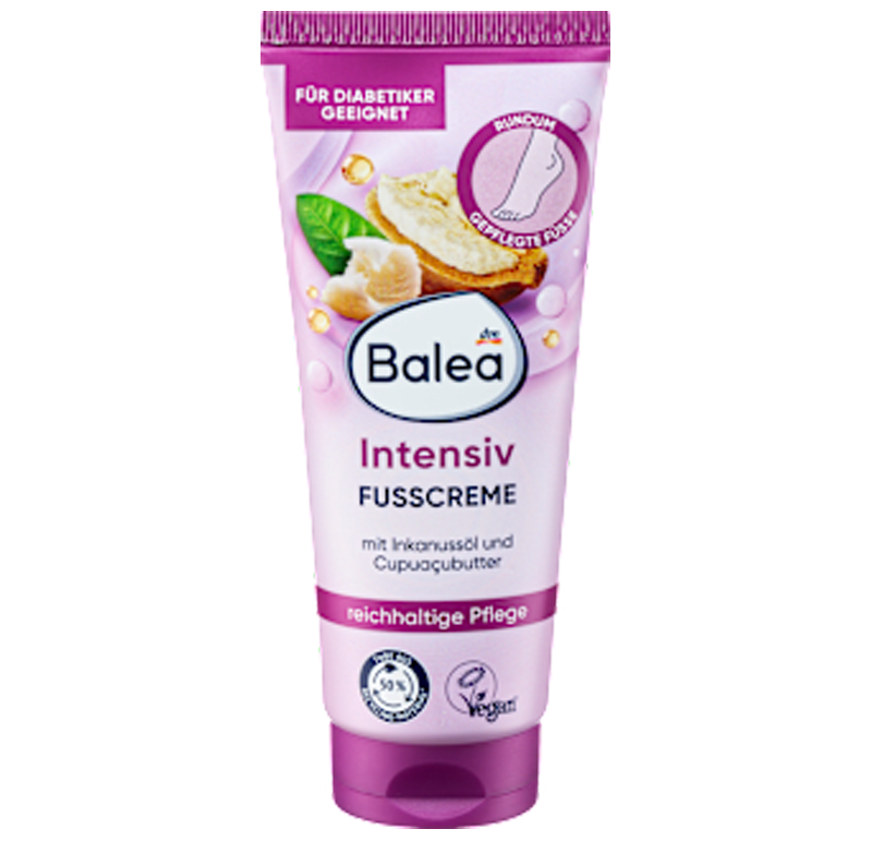 Η κρέμα ποδιών Balea Intensive περιποιείται τα πόδια με μια πλούσια σύνθεση από έλαιο καρυδιού Inca, αμυγδαλέλαιο και βούτυρο cupuacu. Αναπτύχθηκε ειδικά για να αφήνει την επιδερμίδα απαλή και ελαστική. Αυτή η κρέμα προσφέρει ευχάριστη φροντίδα που επαναφέρει τα ξηρά και ταλαιπωρημένα πόδια στην απαλή, περιποιημένη τους κατάσταση.