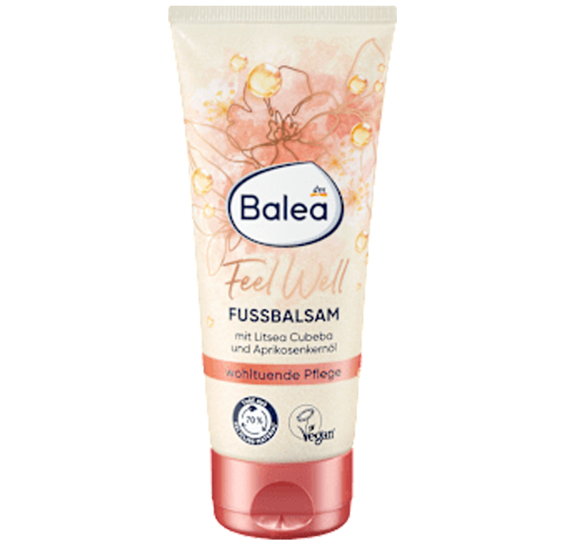 Το Balea Feel Well Litsea Cubeba Foot Balm προσφέρει καταπραϋντική φροντίδα και αφήνει τα πόδια απαλά σαν μετάξι. Το balm περιέχει ενυδατική γλυκερίνη και πανθενόλη, καθώς και βούτυρο κακάο και έλαιο βερίκοκου, που προσφέρουν απαλότητα.